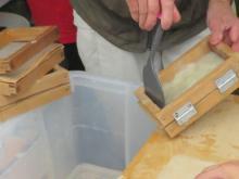 杉原紙は主にコウゾを原料としますが、こちらは佐用町のミツマタを使った紙漉き体験。